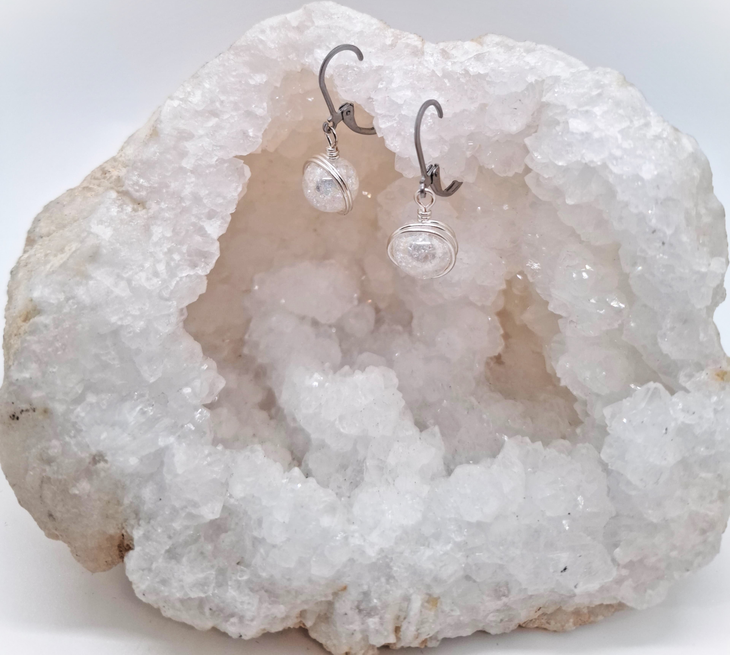 Opis: Ručno izrađene posrebrene naušnice galvanizirane srebrom sa gorskim kristalom veličine kamena 1cm i udicom od nehrđajućeg čelika.