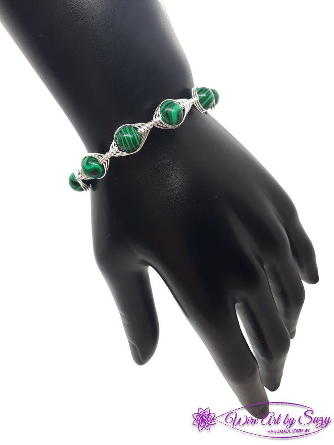 Ručno izrađena posrebrena narukvica galvanizirana srebrom s malahitom.