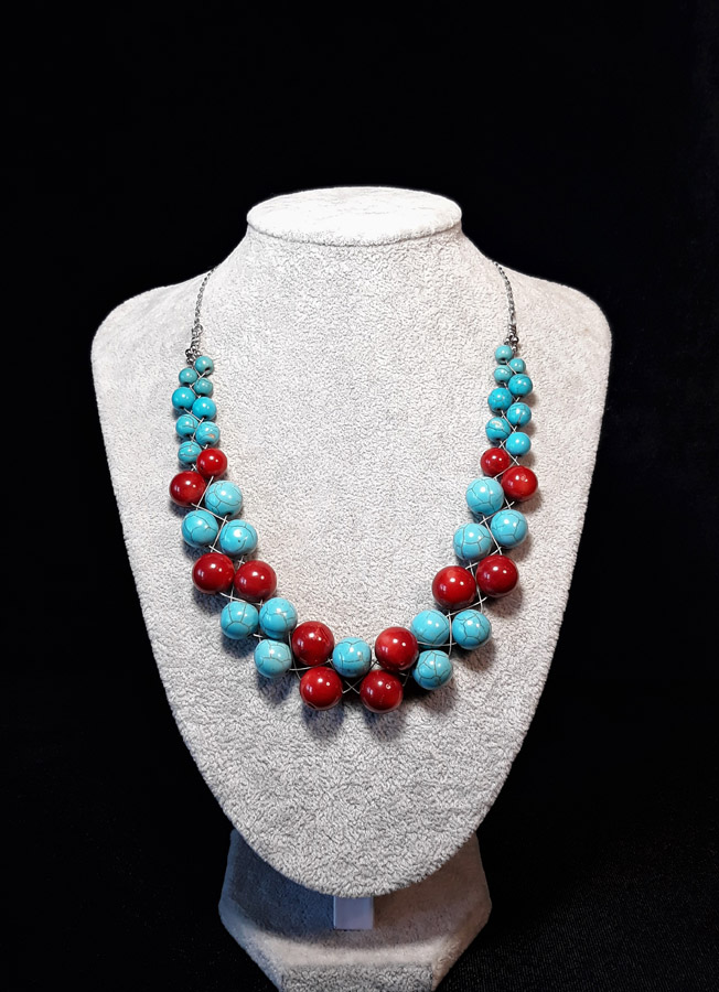 Ručno pletena ogrlica sa tirkiznim hovlitom i koraljima.